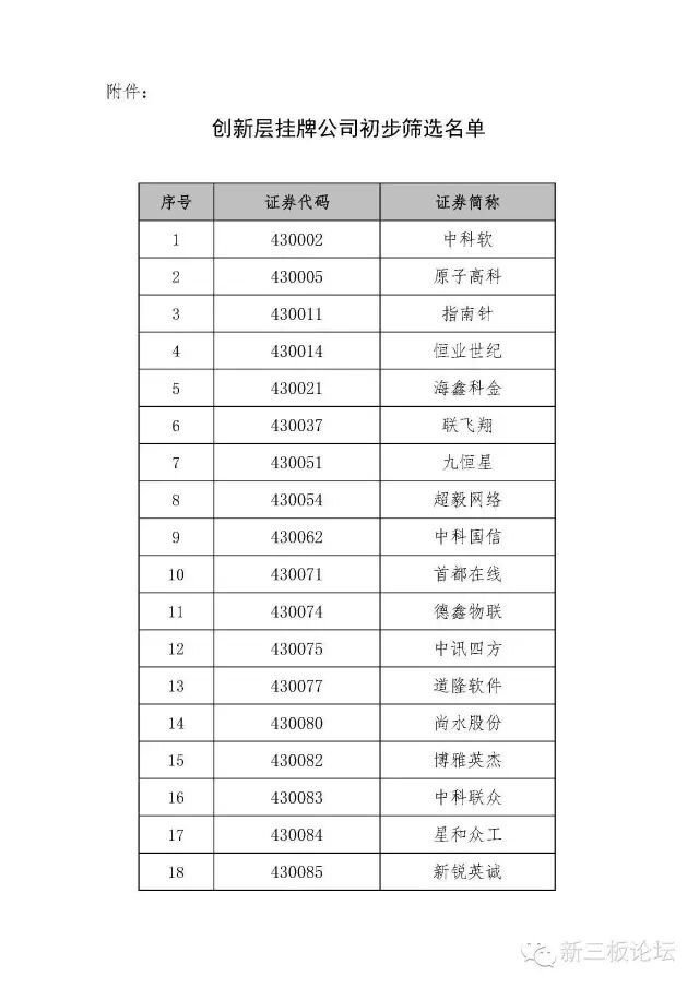 股转公司表示,根据《关于发布<全国中小企业股份转让系统挂牌公司分层管理办法(试行)>的公告》和《全国中小企业股份转让系统挂牌公司分层管理办法(试行)》第六条、第七条的规定,全国股转公司初步筛选出符合创新层标准的挂牌公司名单,现向市场公示。